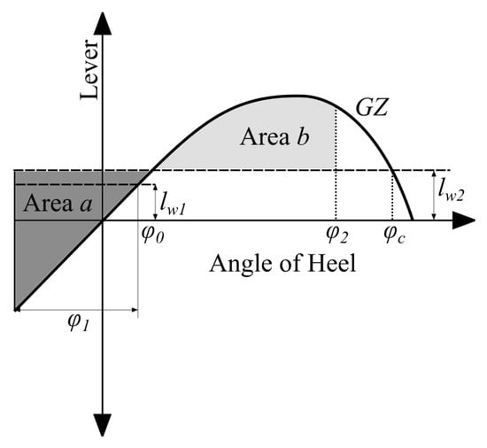 If the -curve for the vessel is known, it is straightforward to compute the angles given in Figure 4 and obtain  and . The guidelines do make the assumption that the leeward side is to starboard (following typical conventions) and that the vessel is largely symmetric. In addition, less regular -curves, which may include features such as loll, which occur in practice, may present numerical and theoretical challenges which require special consideration.