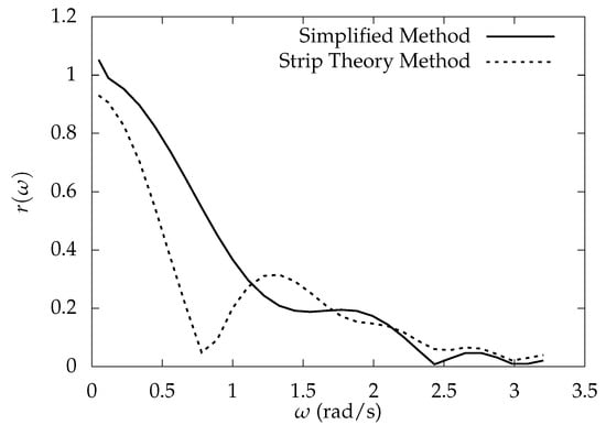 The computation of  is a key aspect of the assessment of level 2, for which a simplified method is provided, based on Froude–Krylov forcing on equivalent area sections. However, the guidelines permit computational-based methods, which should reasonably include the methods described in []. Since most implementations of the guidelines will likely have access to a geometric model of the vessel, it is reasonable to assume that a computational method, based on a linear potential flow strip theory or panel method, would offer an equivalently robust manner to compute . To this end, both the simplified method and the strip-method were implemented. Figure 6 gives a comparison between the methods for a generic box barge. One will notice the considerable difference between the results, which raises a question as to which method is preferred.
