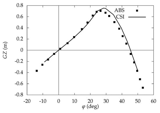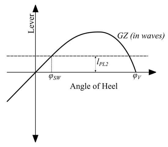 The first criterion considers the minimum angle of vanishing stability, , as illustrated by Figure 10, and the second evaluates the maximum angle of equilibrium, , of the vessel subjected to a heeling lever, , which corresponds to a wave-induced moment. To compute these quantities, the vessel is subjected to ten different wave heights, , ranging from  L to  L. For each of these waves,  is computed according to the relationship , where  is the ith wave height, L is the vessel length, d is the draft, and  is the service speed Froude number. Then, for each wave height, ten different crest locations along the length of the ship are considered, ranging from  L aft of midships to  L forward of midships. For each crest location, the  and  are computed. Across all crest locations, only the minimum  and maximum  are retained, effectively the ‘worst case’ values for the given . The result of this process is a curve describing the  and  over a range of wave heights.