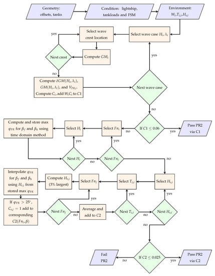 Using these curves, the  and  for each short-term wave spectrum is computed by computing the 3% largest wave height from each short-term seaway and then interpolating the corresponding  and  from the curves. The guidelines specifically indicate that the wave spectrum should be “filtered according to ship length”. The filtering process is not explicitly given, but it can be found in [], where each spectral ordinate is multiplied by a length-based factor. The interpolated values of  and  are then compared to prescribed limits: 30 degrees for  and 15 or 25 degrees for , depending on whether the vessel under consideration is a passenger ship or otherwise. A complete process diagram for an algorithmic implementation of PL level 2 is given by Figure 11.