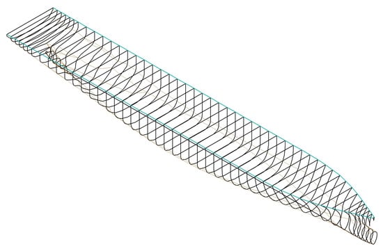 Isometric view of fishing vessel geometry in section-based GF format. Blue lines mark the deck edge. See Section 6 for a link to download this geometry file.