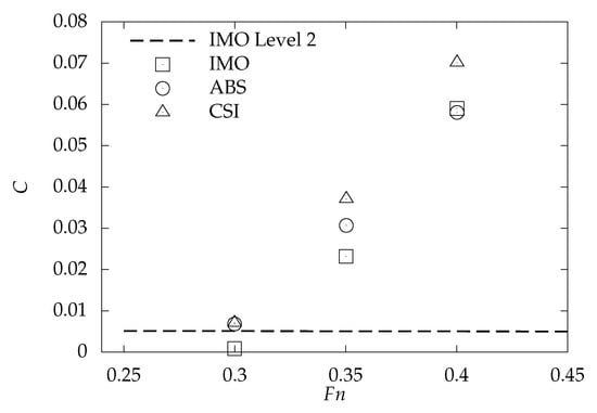 It is noted that damping, especially bilge keel area , is highly important to achieving realistic assessments, and this sentiment is reinforced by discussions in [,,,]. Unfortunately, the influence of damping on several of the modes, perhaps most importantly on the level 2 excessive acceleration and parametric roll, leaves great room for variability of results. Users and reviewers of the criteria must be aware of the influence of damping and seek reasonable input values.