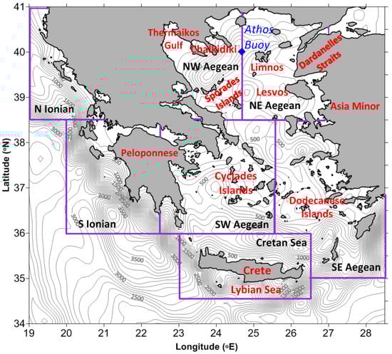 Bathymetry of the study area divided into 7 subregions: northwestern (NW) Aegean, northeastern (NE) Aegean, southwestern (SW) Aegean, southeastern (SE) Aegean, the Cretan Sea, northern (N) Ionian, and southern (S) Ionian. The main topographical features described in the study are marked. The location of the Athos Buoy (blue, Poseidon System) is also marked. Each subregion is defined by the magenta lines and the neighboring land boundaries.