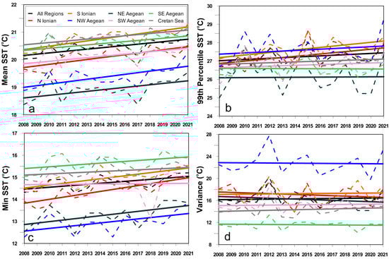 Annual variability (dashed lines) and trends (continuous lines) of: (a) the mean sea surface temperature (SST; °C); (b) the 99th percentile of SST; (c) the minimum (min) SST; and (d) the variance, averaged over 8 regions (all regions: black; N Ionian: red; S Ionian: orange; NW Aegean: blue; NE Aegean: dark green; SW Aegean: purple; SE Aegean: light green; Cretan Sea: grey (Figure 1)), for the period 2008–2021. Note that the dataset of 2021 extends until 15 November.