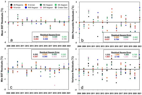 Residuals derived between the observed mean annual, and the respective trend values of: (a) the mean sea surface temperature (SST; °C); (b) the 99th percentile of the SST; (c) the minimum (min) SST; and (d) the variance, averaged over 8 regions (all regions: black; N Ionian: red; S Ionian: orange; NW Aegean: blue; NE Aegean: dark green; SW Aegean: purple; SE Aegean: light green; Cretan Sea: grey (Figure 1)), for the period from 2008–2021. The residual square error (°C) for each trend is also shown.