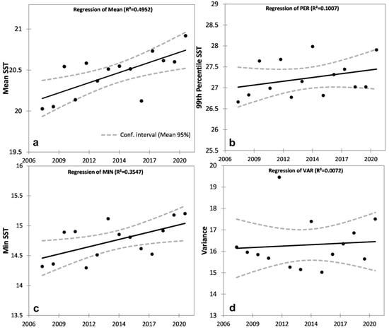 Annual variability (dots) and trends (continuous black lines) of: (a) the mean sea surface temperature (SST; °C); (b) the 99th percentile (PER) of the SST; (c) the minimum (min) SST; and (d) the variance, averaged over all regions for the period 2008-2021. The confidence intervals (95%; grey dashed lines) for each case are shown.