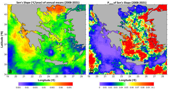 Spatial distribution of: (a) the Sen’s slopes (°C/year) of annual sea surface temperature (SST) means; and (b) the respective MK statistical significance thresholds (p value), derived from the 2008–2021 period.