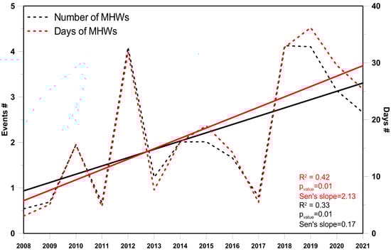 The formation of marine heat waves (MHWs) was computed and analyzed for the entire study region, and for the whole time period. Both the annual number of MHW events and their total annual durations (days), which were averaged over the AIC domain, revealed an increasing trend during the 14-year period (Figure 6). The two trends are statistically significant (p value = 0.01), with relatively high coefficients of determination. The increase in the MHW days is 21.3 days/decade, and the respective increase in the MHW events is 1.7 events/decade, in agreement with the trend derived by Darmaraki et al. [19] for the whole Mediterranean Sea, using a different MHW definition and a longer period. Three peaks were computed in 2012, 2018, and 2019, respectively, with approximately four MHWs lasting around 30 to 35 days in total, constituting the high peaks of the mean values presented in Figure 2a. The fewest events occurred in 2008. The last four years (2018–2021) revealed a number of events and durations higher than all the previous periods, with the exception of 2012, when severe and long surface MHWs were observed in the whole Mediterranean basin [19].