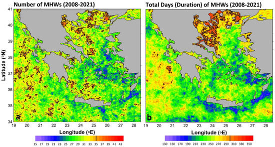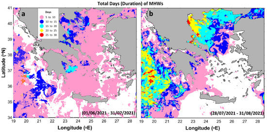 Spatial distribution of the mean heat wave (MHW) durations (days) for: (a) June–July 2021, and (b) August 2021. The detection of the MHWs is based on the daily SSTs of 2021 and the baseline temperatures derived from the entire study period (2008–2021).