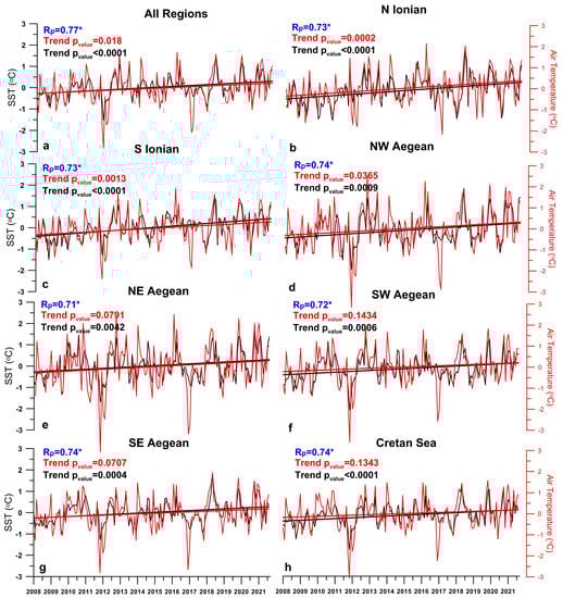 Monthly evolution without the seasonal cycle of sea surface temperature (SST, black line, °C) and air temperature (red line, °C), averaged over: (a) all regions; (b) N Ionian; (c) S Ionian; (d) NW Aegean; (e) NE Aegean; (f) SW Aegean; (g) SE Aegean; and (h) Cretan Sea, over the 2008–2021 period. The linear trend, the respective trend p value, and the Pearson correlation coefficient (Rp) between the two time series are shown. One (*) and two (**) asterisks indicate statistically significant correlations of 99% and 95%, respectively.