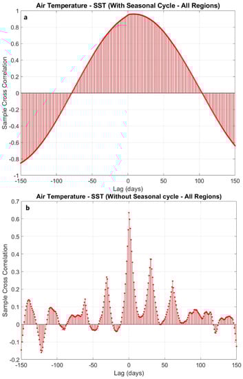 Cross correlation between air temperature and sea surface temperature (SST) daily values, averaged over the entire study domain, (a) with the seasonal cycle, and (b) without the seasonal cycle. The y- and x-axes represent the Pearson correlation coefficients and the lag (days) between the two time series, respectively.