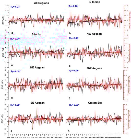 Monthly evolutions, without the seasonal cycle, of the sea surface temperatures (SSTs, black line, °C) and wind speeds (red line, m/sec), averaged over: (a) all regions; (b) N Ionian; (c) S Ionian; (d) NW Aegean; (e) NE Aegean; (f) SW Aegean; (g) SE Aegean; and (h) the Cretan Sea, over the 2008–2021 period. The linear trends and the Pearson correlation coefficients (Rp) for each case are shown. One (*) and two (**) asterisks indicate statistically significant correlations of 99% and 95%, respectively.