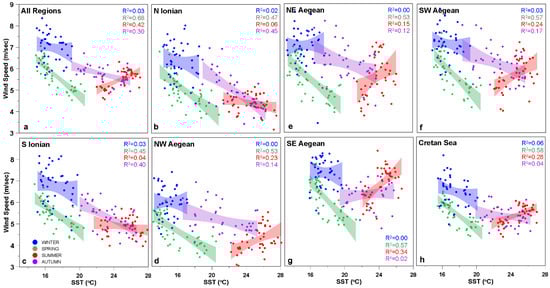 Scatter diagrams of the mean monthly wind speeds (m/sec) and sea surface temperatures (SST; °C), averaged over: (a) all regions; (b) N Ionian; (c) S Ionian; (d) NW Aegean; (e) NE Aegean; (f) SW Aegean; (g) SE Aegean; and (h) the Cretan Sea. Each season (winter, spring, summer, autumn) consists of all the respective months of the entire 2008–2021 period, and they are marked with different colors. The 95% confidence intervals and the coefficients of determination (R2) for each case are also shown, with the same seasonal colors.