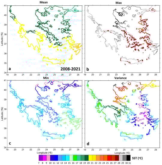 Spatial distribution along the coastline of the study domain of the (a) mean sea surface temperature (SST); (b) the maximum (max) SST; (c) the minimum (min) SST; and (d) the variance of the SST, derived from the daily SST values of the study period (2008–2021).