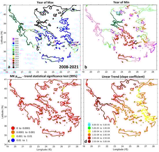 Spatial distributions along the coastlines of the study domain of: (a) the year of the maximum (max) sea surface temperature (SST); (b) the year of the minimum (min) SST; (c) the p values of the Mann–Kendal statistical significance test (99%); and (d) the respective slope coefficients of the linear trends, derived from the daily SST values of the study period (2008–2021).