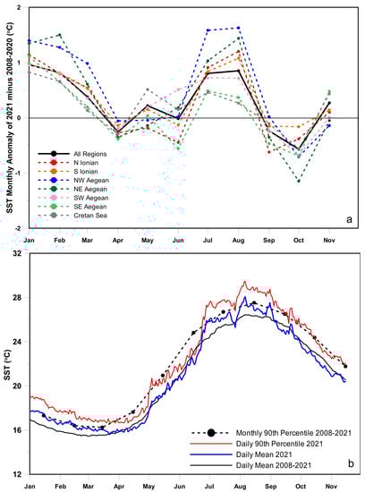 (a) Monthly SST anomalies computed from the differences between the 2021 mean monthly means (January to August) and the respective mean monthly means of the entire 2008–2021 period, spatially averaged over each study subregion. (b) Daily 90th percentiles (red line) and means (blue line) of SSTs derived from the entire region for 2021. The black lines represent the mean monthly 90% percentiles of the SSTs (dashed with black dots) and the daily climatology (solid), derived from the 2008–2021 period, and averaged over the entire region. Note that the dataset of 2021 extends until 15 November.