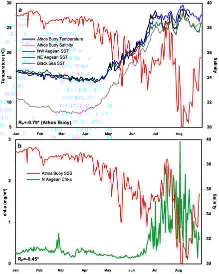 Daily evolutions of: (a) temperature (black), and salinity (red), measured at a 1-m depth at the Athos Buoy, and satellite-derived sea surface temperatures (SSTs), averaged over the NW (blue), and the NE (green) Aegean, and the entire Black Sea (grey); and (b) salinity (red), measured at a 1-m depth at the Athos Buoy, and satellite-derived chlorophyll-a (chl-a) concentrations (green), averaged over the N Aegean (NW and NE combined), from January 2021 to August 2021. One (*) and two (**) asterisks indicate statistically significant correlations of 99% and 95%, respectively.