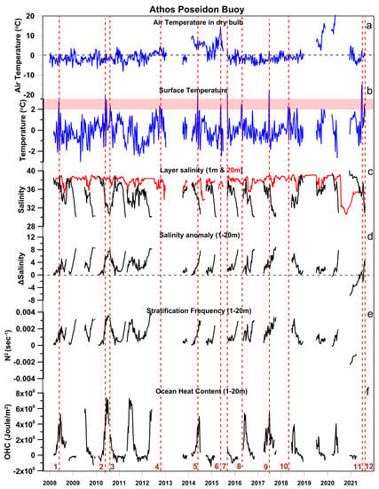 Weekly means of: (a) air temperature in dry bulb; (b) sea temperature at 1 m; (c) salinity at 1 m (black) and salinity at 20 m (red); (d) salinity anomaly between the two layers (1 m and 20 m, ΔSalinity); (e) the Brunt-Väisälä stratification frequency (N2), derived between 1 and 20 m; and (f) the ocean heat content (OHC; Joule/m2) of the upper 20 m, derived from the Athos Buoy daily values, without the seasonal cycle. The red dashed lines represent 12 events when the surface temperature was higher than 2°C (red-shaded area in (b)).
