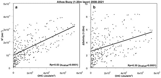 Scatter diagram of ocean heat content (OHC; Joule/m2) of the upper 20 m, and (a) the Brunt-Väisälä stratification frequency (N2; sec-1); (b) salinity anomaly between the two layers (1 m and 20 m, ΔSalinity), derived from the Athos Buoy measurements during 2008–2021. The linear fit, the Pearson correlation coefficient (RP), and the respective p values of the Mann–Kendal significance test for each case is shown.