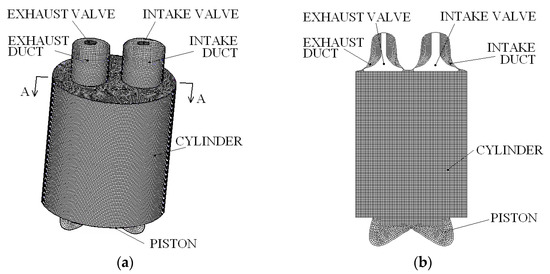 Regarding the CFD model, Figure 1 shows the computational mesh at the bottom dead center position. A deforming mesh was employed in order to implement the movement of the valves and pistons.