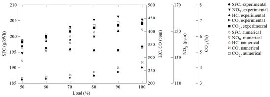 Operating under diesel, the validation with experimental results was developed in previous works [,,] and thus is not shown here in detail. Figure 2 illustrates the experimentally and numerically obtained in-cylinder pressure against the crank angle at 100% load and Figure 3 the experimentally and numerically obtained SFC (specific fuel consumption) and emissions at several loads. In the experimental tests, the gas analyzers Gasboard-3000 and Gasboard-3030 were employed. Operating under the dual fuel mode ammonia-diesel, the validation using experimental results was not realized due to safety reasons. Ammonia is highly toxic and any accident during the experimental sets could have dramatic consequences for the staff. Nevertheless, the ammonia combustion mechanism was validated for several equivalence ratios, temperatures, and pressures elsewhere [], in which satisfactory results have been obtained for the species concentrations. NOx is mainly produced by thermal, fuel and prompt mechanisms, and Mathieu and Peterson found that their model is able to accurately predict NOx.
