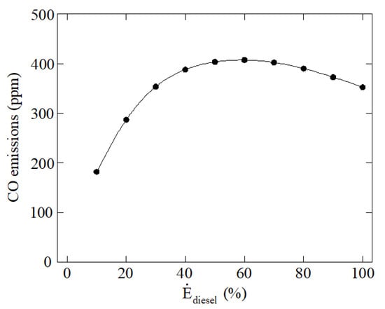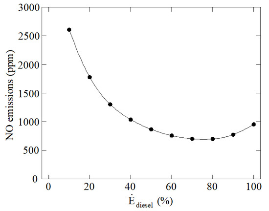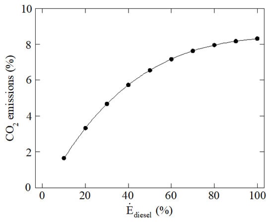 CO2 emissions are illustrated in Figure 8. These emissions are clearly reduced as diesel fuel contribution is reduced too due to the lower carbon content when more ammonia and less diesel is employed as fuel. The relation between the power contribution from diesel fuel and CO2 emissions is not linear because when the power contribution from diesel fuel is low the proportion of ammonia in the fuel is too high to reach the 320 kW established. The heating value of ammonia, 18.6 MJ/kg, is considerably lower than the heating value of diesel, 42.4 MJ/kg. According to this, CO2 is drastically reduced under low power contributions from diesel fuel since the quantity of diesel fuel is much lower than the quantity of ammonia fuel.