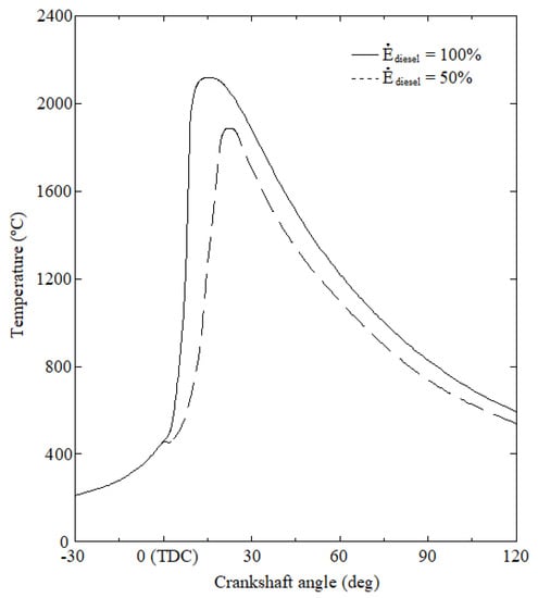 In-cylinder average temperature under 100% and 50% power contribution from diesel fuel.