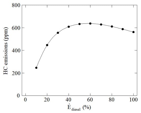 Regarding CO and HC emissions, these are shown in Figure 6 and Figure 7, respectively. As in the case of NO, two opposed effects can also be found. On the one hand, high quantities of ammonia promote less CO and HC emissions due to the lower carbon content of the whole fuel, since ammonia has no carbon. On the other hand, the lower combustion temperatures obtained when using ammonia promote incomplete combustion and thus lead to CO and HC formation. HC and CO are produced mainly by the slow combustion and partial burning caused by lower combustion temperatures. These opposing effects can be shown in Figure 6 and Figure 7. As can be seen, when the power contribution from diesel fuel is low the CO and HC emissions are low too, these increment to a maximum value corresponding to around 50% power contribution from diesel fuel. From this power contribution, the CO and HC emissions decrease again.