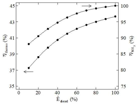 Thermodynamic and ammonia utilization efficiencies against the power contribution from diesel fuel.
