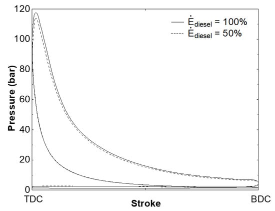 In-cylinder pressure under 100% and 50% power contribution from diesel fuel.