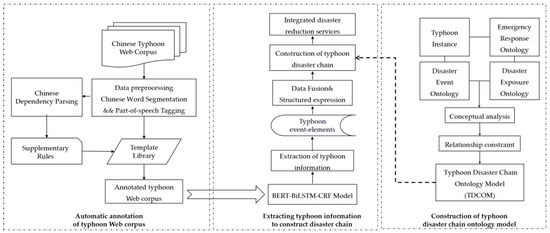 Taking these into consideration the present study proposes a method of constructing a typhoon disaster chain based on Web corpus. Adopting an appropriate structure, this research first constructs a Typhoon Disaster Chain Ontology Model (TDCOM) based on the theory of natural disaster systems. A formalized expression of the typhoon disaster chain is formed by establishing the concepts, properties, and relationships between elements of typhoon disasters. Then, NLP technology is adapted to extract disaster information from massive Web corpus, so as to construct the typhoon disaster chain through data fusion and structured expression. The results show that this method can be used to excavate the incident chain of typical typhoon disasters which can effectively sort out the spatio-temporal variation of typhoon disasters as well as the relevant human social activities. The technique flowchart of this research is shown in Figure 1.