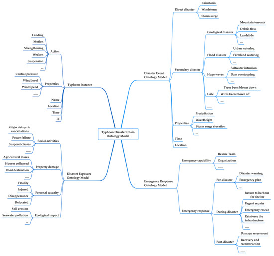 This study refers to the concepts and hierarchical relationships in relevant national standard documents issued by the Chinese government, such as Classification and codes for natural disasters (GB/T 28921-2012), Classification and coding for natural disaster exposure (GB/T 32572-2016), Emergency classification and coding (GB/T 35561-2017). The conceptual framework of typhoon disaster chain ontology is shown in Figure 2.