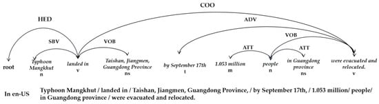 - Supplements templates with Chinese dependency parsing. The same meaning can be phrased by different expressions in typhoon events description, which imposes a limit on information extracting by using the single rule template. Dependency parser can analyze both the semantic associations and dependencies between the constituent units in a sentence, and it can supplement the rule templates effectively to improve the effect of information extraction [25]. For typhoon events, the syntactic relations that this research mainly focuses on are “Subject–Verb” (SVB), “Verb–Object” (VOB), and “Attribute” (ATT). For example, as shown in Figure 3, the sentence translated into English is “Typhoon Mangkhut landed in Taishan, Jiangmen, Guangdong Province, by September 17th, 1.053 million people in Guangdong province were evacuated and relocated”. To make it easier to understand, the Chinese syntactic structure has been transformed into the corresponding English expression. Among them, “Typhoon Mangkhut” is the Subject of “landed”, “Taishan, Jiangmen, Guangdong Province” is the Object of “landed”, “17th September” is the temporal adverbial, “people” is the Object of “evacuated and relocated”, “Guangdong Province” and “1.053 million” are the attributive complement of “people”. Through the traversal of the nodes and dependencies on the syntactic tree, event-elements can be obtained, and the rule templates can be supplemented effectively.