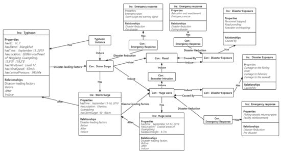 In previous studies, many scholars have discussed the evolution process of typhoon disasters. For example, based on the theory of natural disasters system and the Empirical Statistical Model, Ye analyzed the typhoon disaster cases in Fujian Province according to the historical statistics. Several typical elements were manually selected as the criteria to construct the typhoon disaster chain from the macro perspective [2]. This method can clearly reflect the regional characteristics and conduct disaster assessment rapidly. Combined with the disaster dataset of Hebei Province from 1949 to 2018, Jing conducted research based on the theory of natural disasters system in order to build three disaster chains of Typhoon–Storm, Typhoon–Gale, and Typhoon–Surge. According to these different disaster chains, corresponding disaster reduction measures were proposed to provide support for the management of typhoon disasters [3]. Zhong took typhoon disaster as an example to discuss the mechanism, construction, and presentation of the incident chain. He proposed to perceive the disasters chain as an expression of priori knowledge which reflects the logic of the relationship between different types of secondary disasters in typhoon events. The probability of transformation between two incidents caused by typhoons can be calculated from plenty of historical cases through data mining, case reasoning, and the construction of a Bayesian network, etc. Such a theory can be applied to risk analysis and decision optimization [4]. Zheng selected a typhoon case and adapted the complex network model to construct the nature disaster network. Large numbers of disaster literature are explored with a data mining tool to find the relationship among disasters, and co-occurrence analysis is employed to build a disaster network. On this basis, a method to extract a proper disaster chain was proposed, which is greatly helpful for disaster mitigation and prevention [5]. It can be seen that previous studies mostly used natural disaster system theory, historical disaster statistics, and probability models to build the typhoon disaster chain, which requires much prior knowledge and expert experience. At the same time, less in-depth consideration is given to the distribution of disaster exposure, the constraints of the social environment, as well as the influence of spatio-temporal factors. In addition, due to the different focus of scholars and decision-makers, various disasters and emergency information are less connected with each other, causing problems, such as incomplete content, low reuse rate, and inconsistent expression of typhoon disaster knowledge.