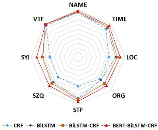 A visual comparison of F1 scores on different models was conducted by using the radar diagram, and the results are shown in Figure 7. It can be seen from Figure 7 that the F1-scores of the BERT-BiLSTM-CRF model on the eight types of event-elements were all at a higher level, indicating that the performance of this model was better than others in the field of typhoon disaster. BERT can fully extract character-level, word-level, and sentence-level features, enhancing the generalization ability of the model. Thus, the BERT-BiLSTM-CRF model achieved the best information extraction effect, with the F1-score being 0.9207, which was 5.24% higher than the BiLSTM-CRF model.
