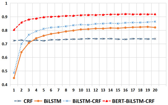 In addition, this study also compared the update of the F1-score in the first 20 epochs of each model. The results are shown in Figure 8. As can be seen, since CRF is a statistical-based sequence labeling model, the F1-score barely changed with the training. While the F1-score of the traditional neural network model was quite low at the initial stage of training, it rose and then stabilized at a high level after several learning iterations. After the introduction of BERT, the model achieved a higher F1-score at the initial stage of training, and gradually improved and stabilized at a high level. The BERT-BiLSTM-CRF information extraction model showed the best performance in the F1 value update.