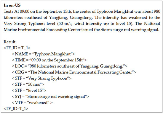 - Construction of template library based on POS tagging and regular expressions. Since similar rules are shared by event description, analyzing which can obtain the linguistic characteristics of event expression. Based on these characteristics, regular expressions and POS tagging are used to establish the rule templates for the temporal, spatial, and attribute information of typhoon events, respectively. For example, the text which translated into English is “central pressure/995/pha” can be matched with the POS combination of “stf + m + q” or the rule template of “N (Disaster attribute) + X (Attribute value) + Q (Unit noun)”.