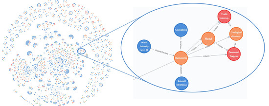 In this study, typhoon information was extracted by using the model designed in the experiment. The example of extraction results is shown in Figure 9, the Chinese text was translated into English. In the experiment, the obtained typhoon event-elements were regarded as nodes that were stored in the Neo4j graph database. Neo4j is a widely used open-source graph database, which stores connected data as a network structure of flexible graphs rather than traditional static tables [28]. Part of the results is shown in Figure 10 where the blue nodes represent typhoon attribute information, the green nodes represent emergency response information, the orange nodes represent disaster event information, and the red node represents disaster exposure information.