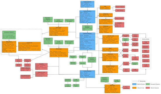 This research realized the construction of a typical typhoon disaster chain, which not only shed light on analyzing the evolution process of typhoon disasters but also provided a basis for exploring the impact of typhoon disasters on social activities. In addition, it provided scientific support for typhoon disaster prevention and emergency management. Hopefully, combined with practical applications to build an intelligent comprehensive disaster management and reduction system based on the emergency scenarios of the entire disaster process, this research can provide services, such as disaster information management, emergency information push, and assistant decision-making, etc. in the future.