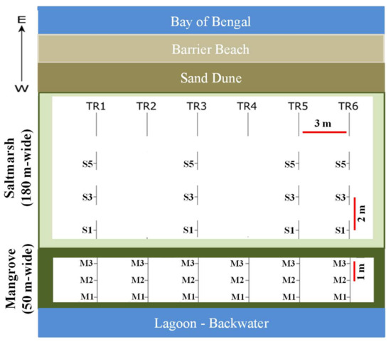 Schematic illustration of sampling stations. TR: transects (1–6). M: mangrove stations. S: saltmarsh stations.