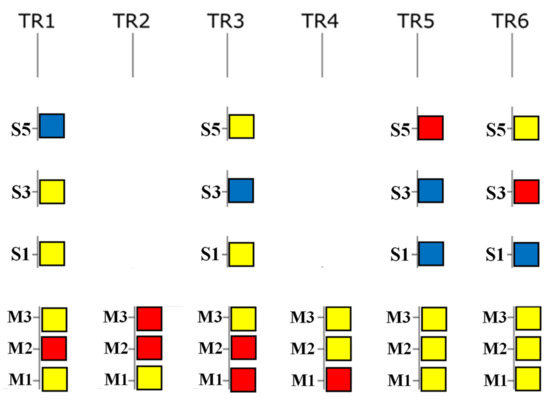 Percent contribution of mangrove-derived organic matter (fmangrove) within sampling stations. TR: transects (1–6). M: mangrove stations. S: saltmarsh stations. Red squares: 95% to >80%; Yellow squares: 80% to >50%; Blue squares: 50% to 10%.