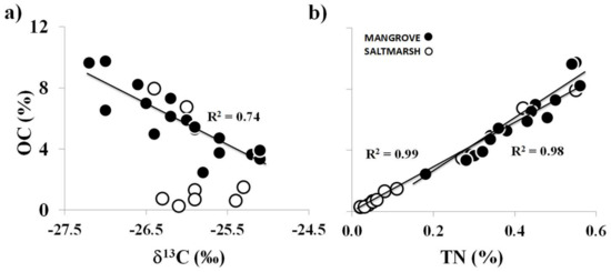 (a) Relation between organic carbon (OC) vs. δ13C. (b) Relation between organic carbon (OC) vs. total nitrogen (TN) for mangrove and saltmarsh zones.