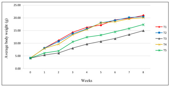 From Table 1, no significant differences were found between the means of T2 and T4 treatments for all growth indicators. Similarly, no significant differences were found between the means of T1 and T2 treatments for all growth indicators, except for the feed efficiency ratio (FER). However, significant differences were found between T1 and T4 treatments in terms of final biomass weights, total biomass gains, specific growth rate (% SGR), feed intake per fish (FI), feed conversion ratio (FCR), and FER, but no significant differences in terms of initial weights, final weights, weight gains, initial biomass weights, protein efficiency ratio (PER) and survival rate (% SR) between the same treatments (Table 1). Furthermore, clear significant differences were observed within the means of body weight for T3 and T5 treatments compared to the T1 treatment (Figure 1). Again, clear significant differences were observed between the means of final body weight for T3 and T5 treatments at the end of the experiment (Table 1, Figure 1).