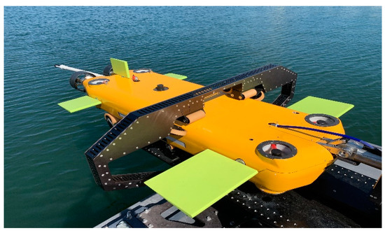 The hardware design of the proposed TUP was realized considering functional factors. Figure 1 illustrates the overall system configuration and design results. In addition, the target specifications of the designed TUP are presented in Table 1. The TUP comprises six degrees of freedom that enable motions corresponding to roll, pitch, yaw, X, Y, and Z. Strain terminations are positioned at the front to connect the submersible cables for towing functions from the USV. To minimize interference with the movement of the cable during the vertical movement of the strain termination, a space for the cable to move is allocated inside the TUP. The outline is designed in a streamlined and flat shape, which is beneficial for maintaining posture in water. It was ultimately arranged to maintain posture and control the water depth using the front, rear, left, right, and vertical rudder, and six thrusters. The size and area of the rudder were selected via an analysis based on the design model to generate the drag force acting on the hull and the force required to reach the target water depth. The pressure-resistant box in which the electrical system is mounted is manufactured by reflecting the structure, such that it can withstand water pressure within a 5-bar environment (i.e., at a 50 m depth). The total buoyancy was designed and applied to operate with a positive buoyancy, and it was possible to adjust the weight of the thruster drum to balance it. Regarding the magnet sensor, it was designed to be detachable if necessary. In Figure 2, the actual production results are presented based on the designed contents.