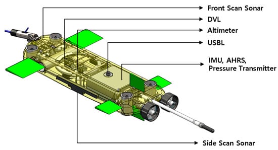 The sensors mounted on the TUP were configured and applied as presented in Table 2. In addition, the position arrangement of the sensor is illustrated in Figure 3. For its smooth operation, the sensors were arranged considering the location where interference was minimal, and no functional problem was identified in the operation of the sensors. Regarding the side scan sonar (SSS) equipment for the subsea topography survey, antennas were positioned on the left and right sides of the lower end of the TUP, and the control board had a dedicated pressure box in the TUP. The front looking sonar (FLS) was placed in the front to detect obstacles and objects identified in the front. To monitor the underwater environment, two sets of cameras and light-emitting diode (LED) lights were positioned in front and at the bottom, respectively. A magnet sensor was mounted on the rear to detect metals such as mines/torpedoes. To measure the speed of the designed TUP, the Doppler velocity logger (DVL) sensor was installed on the lower surface to calculate the relative speed according to the flow rate and position of the TUP. To measure the depth and altitude of the TUP, a depth sensor and an altimeter were mounted on the bottom of the TUP. A temperature sensor installed inside the depth sensor was adopted as a temperature sensor to measure the water temperature. To measure the position of the TUP underwater, an inertial measurement unit (IMU), attitude heading reference system (AHRS), and ultra-short baseline (USBL) transponder were placed on the upper surface of the pressure box. An LED flasher that could be operated in the case of an emergency was positioned at the top.