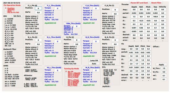 The user interface (UI) was configured as illustrated in Figure 6 to output and check messages sent and received through the driving module and sensor in the TUP. Data were transmitted and received at a set period for each node, and the UI software was developed to receive, print, and check these data. Regarding the control node for maintaining the TUP posture and controlling the depth, it was necessary to tune the proportional integral derivative (PID) gain parameter. Accordingly, each parameter was input and applied to the control loop. A function was also added to ease the PID gain-tuning process.