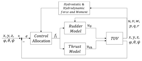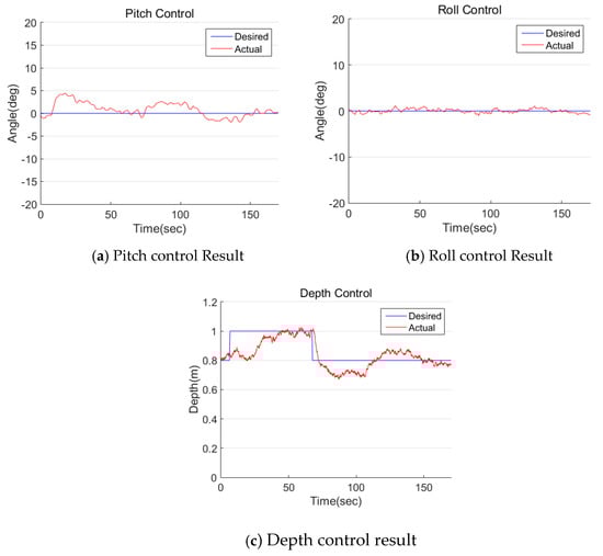 A PID controller was used to follow the control input information for the roll, pitch, and depth of the TUP, and the parameters applied to the controller were empirically input and derived, such that it could be followed using a graph based on the control input versus output information. Figure 7 shows the block diagram of the entire control structure.