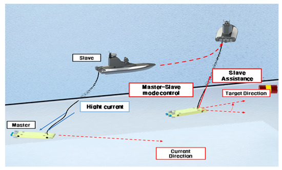 Unmanned surface vehicle (USV)–TUP interoperating technology is being developed to compensate for navigation errors in the underwater environment and to overcome battery problems and communication restrictions triggered by long-term operations [8]. Previous studies have considered the application of an efficient dynamic model-based control technology between the USVs and TUPs [9,10] and investigated the realization and control technology of cooperative operation via position measurement/adjustment between the USVs and TUPs [11].