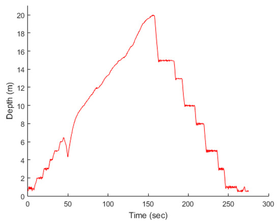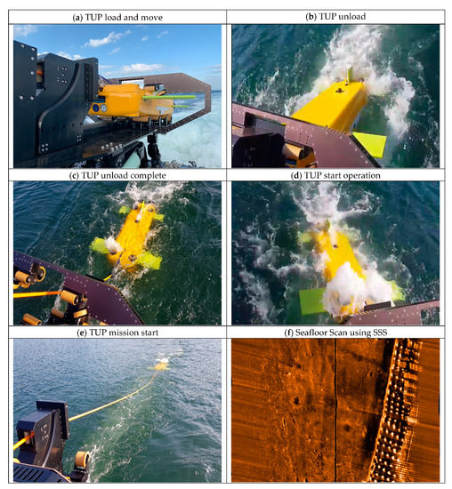 The designed TUP was mounted on the USV by LARS and moved to the target point, as illustrated in Figure 11a. LARS is a system designed to automatically retrieve the TUP and perform the tug control of the TUP using the tension of the cable. When it arrives at the target point, the launch command is transmitted from the upper control unit to the LARS, and the launching process is performed according to the LARS control sequence, as shown in Figure 11b. In LARS, the mode is defined for each cable length, and when the cable length corresponding to the launch is derived, the launch is completed, as illustrated in Figure 11c. When the launch complete status is reached, LARS sends a launch completion command to the TUP, and the TUP receives this command and executes the attitude control mode, and the operation commences, as illustrated in Figure 11d. At the target point, the water depth is measured using an altimeter mounted on the TUP. The target operating depth is defined considering the water depth, and the depth control commences, as shown in Figure 11e. When arriving at the target point and depth, the SSS information is checked, as illustrated in Figure 11f.
