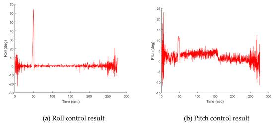 This experiment was conducted on 7 October 2021, off the coast of the Jangmok Port, Geoje, Gyeongnam. The weather was clear and the wind was moving in the northwest—–north (morning)/south–southwest (pm) direction, the wind speed was 3–6 m/s, and the wave height determined at a position where observation was performed at 0.5 m. By setting the target depth of the TUP to 20 m, it was confirmed that maintaining the water depth is possible. As illustrated in Figure 12 and Figure 13, the error for the roll posture occurs up to a maximum/minimum of 64.3° to −22.5°, with an average of 0.67°. The error for the pitch posture occurs up to the maximum/minimum of 23.1 to −11.5°, with an average of 2.29°.